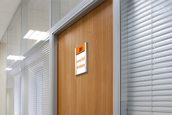 Las señales de la puerta de la oficina del sistema Vista Square le dicen a los visitantes desde el primer momento que están ingresando a un lugar de calidad. Elija el diseño que coincida con el interior de su oficina y adapte el tamaño y las dimensiones para que se ajusten al contenido exacto del letrero.